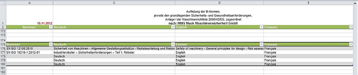 Die obere Tabelle enthält alle harmonisierten B-Normen mit Titel, in der Sortierung, wie Sie sie von Dipl.-Ing. Siegbert Muck, MMS Muck Maschinensicherheit GmbH, erstellt wurde.